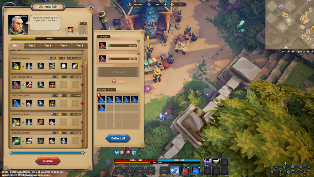 A production system was developed featuring various stations -such as the sawmill or the kitchen-where items could be crafted from materials through a generic recipe system. This approach allowed new stations to be added with minimal effort from both programming and design teams. The system also included station-level progression with recipe unlocks and worker-feeding mechanics, as well as a basic dialogue system
